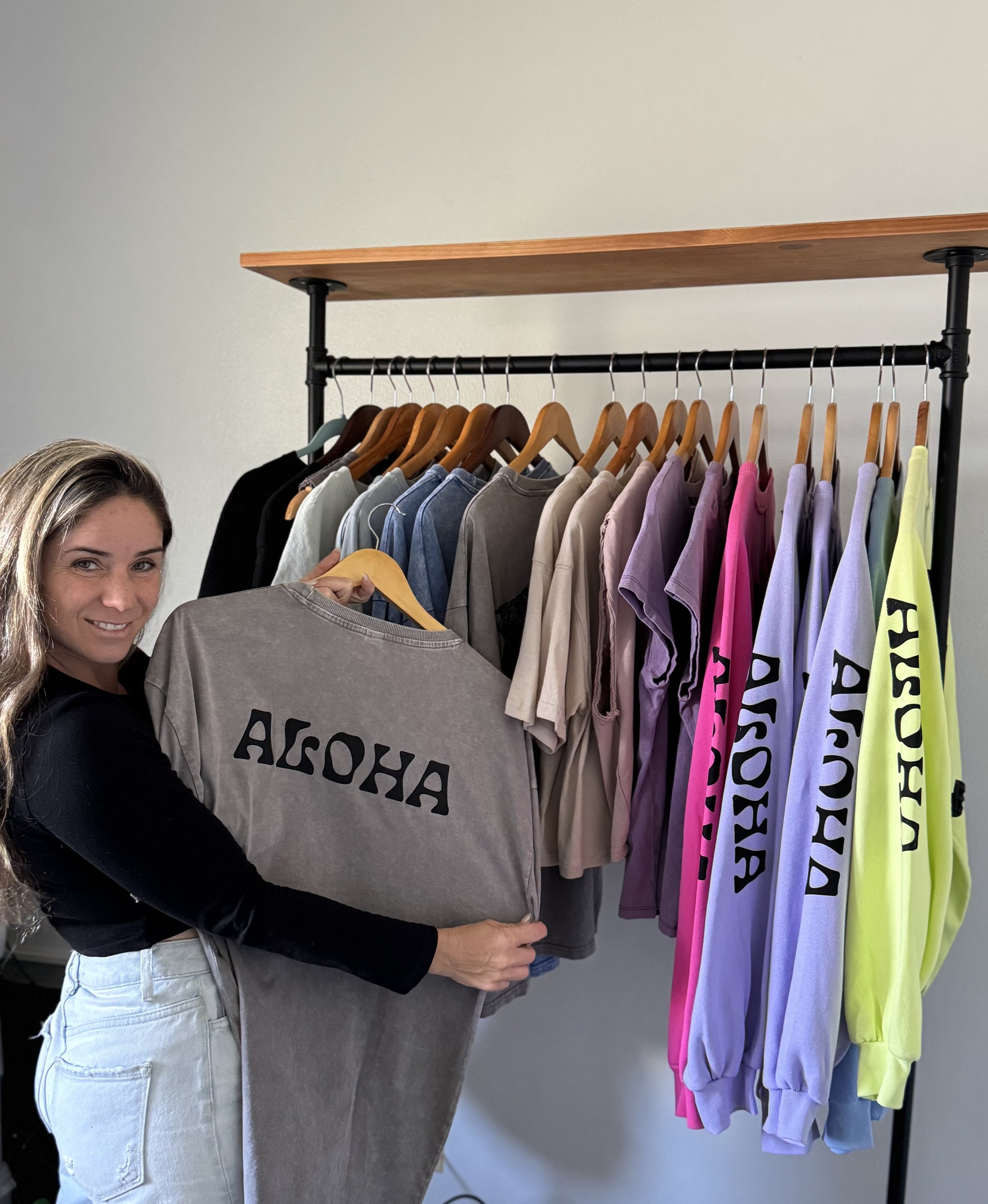 Every piece begins as a hand-drawn illustration. From there, I create each stencil by exposing my screens under the Maui sun. Once the design is transferred, I print every piece freehand in my home studio, making each item feel personal and intentional.